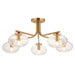 Blending classic curves with modern simplicity, this 5-light semi-flush ceiling fitting features softly rounded arms in a warm brass finish and hand-blown clear bubbled glass shades. Each globe subtly distorts and enhances the light, creating a gentle sparkle that adds atmosphere to any room. Perfect for lower ceilings in living areas, bedrooms, or hallways, it brings sculptural elegance and timeless design to contemporary interiors.