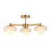 With a refined mid-century aesthetic, this 3-light semi-flush ceiling light features frosted outer glass shades enveloping opal glass spheres for a beautifully diffused glow. The brushed aged brass metal frame adds warmth and sophistication, while the clean lines and geometric form offer a sleek, modern profile. Perfect for living rooms, dining areas, or hallways, it delivers statement-making style with soft, ambient lighting.