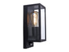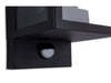 Popular, modern wall light now featuring a versatile PIR. Black finish on a stainless steel frame with clear glass. PIR detection angle 120 degrees, range 8 metres, duration adjustable 10 secs to 5 mins.
