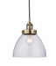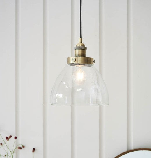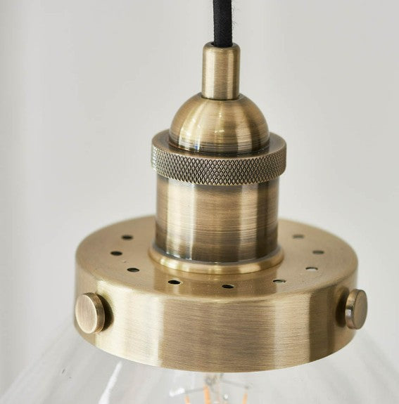 An authentic 'resto' style industrial pendant, finished in antique brass plating with authentic knurled lamp holder details and clear glass shades. Suspended from height adjustable black fabric flex, pair with filament LED lamps for that perfect industrial style. The perfect addition for today's stylish homes to create that on trend bar, bistro look.