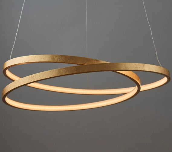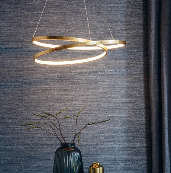 Contemporary LED ceiling pendant with a striking continuous loop of LED lights. Perfect for modern interiors and finished in a luxurious gold leaf. Seemingly the pendant "floats", suspended from subtle clear cables that are height adjustable. The impressive loop design is an amazing centrepiece to any interior, creating an striking light effect.