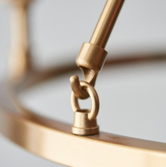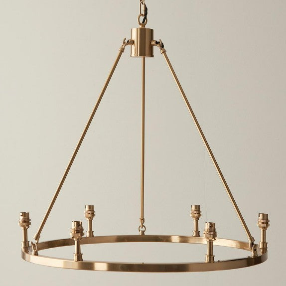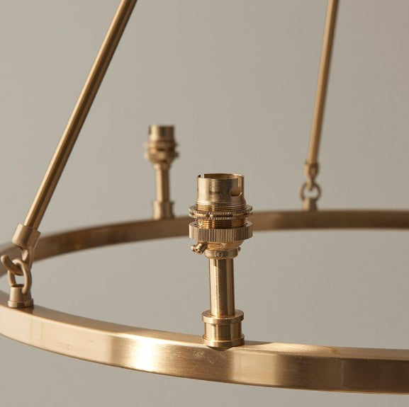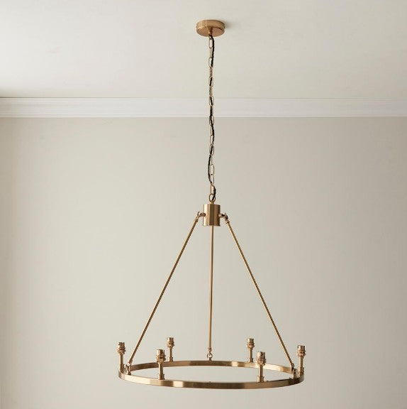 The timeless simplicity of a hoop design finished in aged brass plate with authentic brass B22 lamp holders makes the Chester the perfect addition to your home. With height adjustable chain and twisted fabric flex. This is a fitting only pendant, complete the look with 6 of our 16cm decorative fabric shades for a timeless chandelier to be proud of.