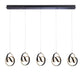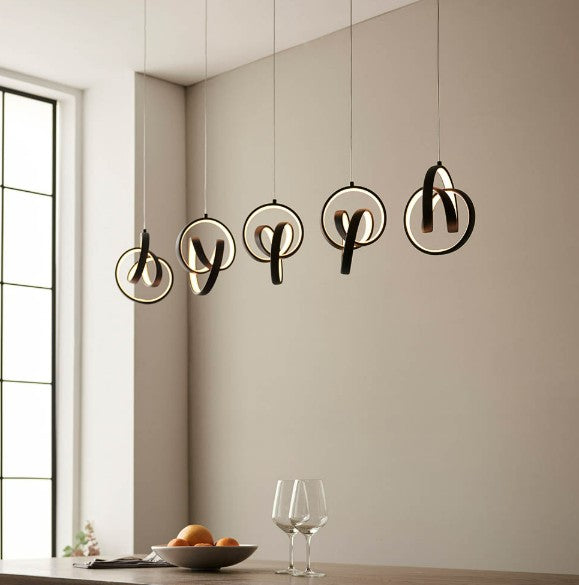 LED 5 light pendant with textured matt black finish. Intriguing swirling loops effortlessly suspend from clear flex lengths that can be adjusted in height to create a contemporary statement pendant. Dimmable when twinned with a trailing edge dimmer switch. Perfect for placing above a dining table or breakfast bar.
