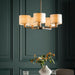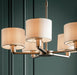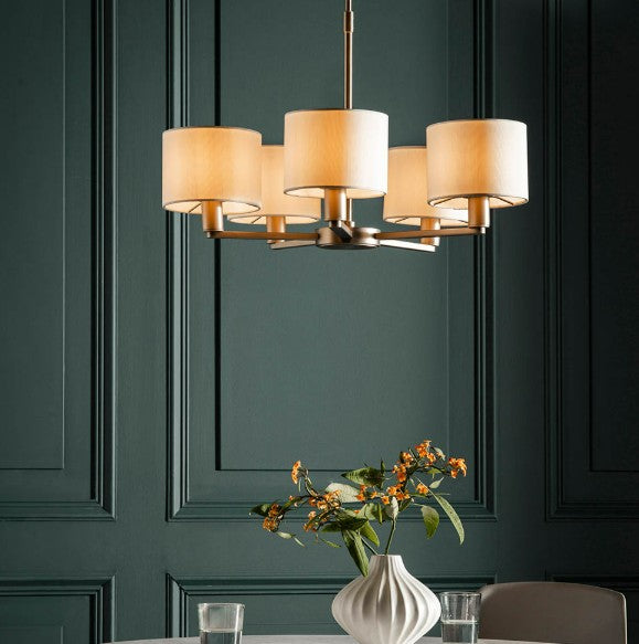 An understated modern 5 arm pendant, mixing a subtle matt nickel plated finish with timeless vintage white faux silk shades. Modern styling for today's interiors. Matching items also available.