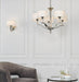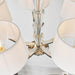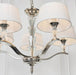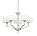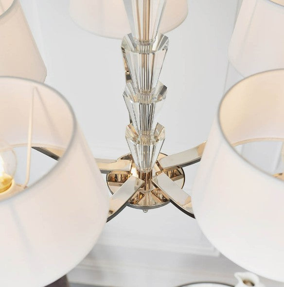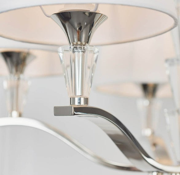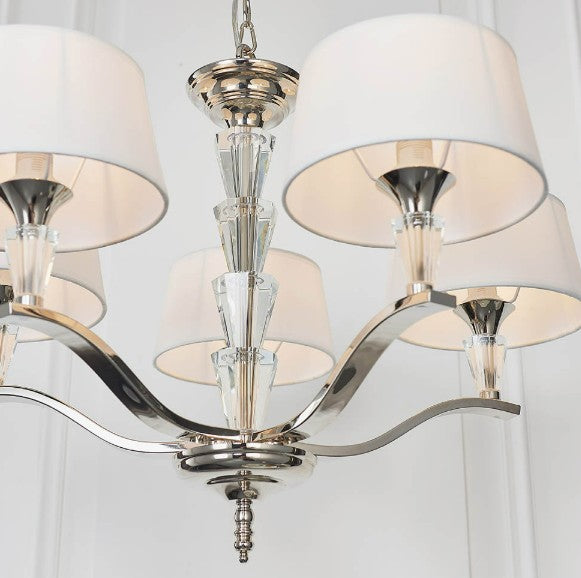 The Fiennes 5 light fitting finished in chrome effect with crystal detailing and white fabric shades. This fitting has a adjustable drop, is dimmable and suitable for use with LED lamps. Matching wall and table lamp also available.