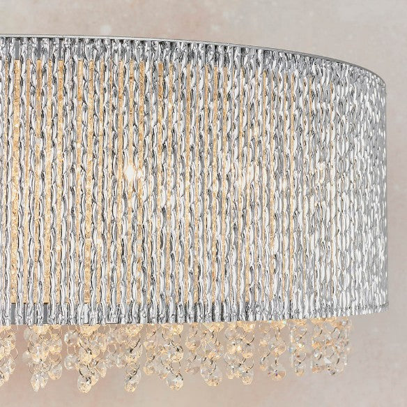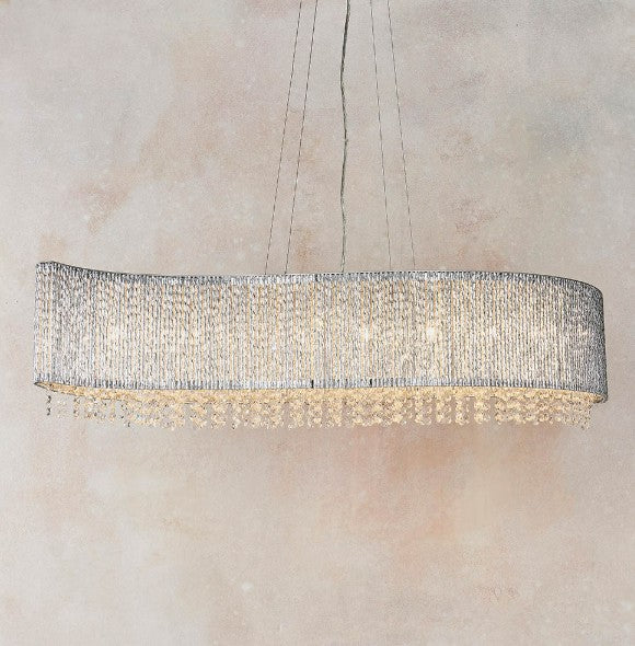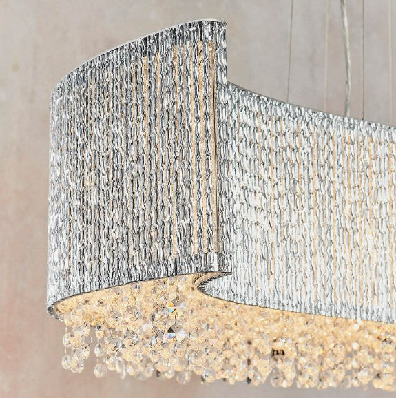 The perfect opulent linear pendant, create striking light patterns with thousands of high quality crystals housed within decorative twisted polished chrome rods formed into a unique sweeping wave shape, the perfect centerpiece for the most loved rooms of your home.