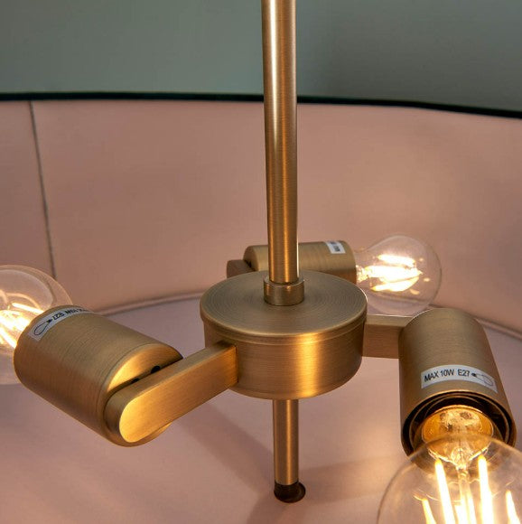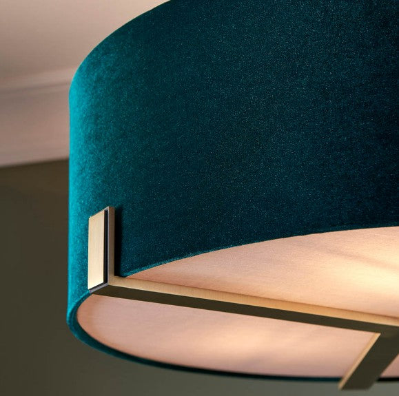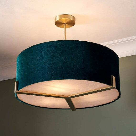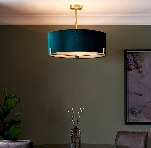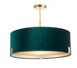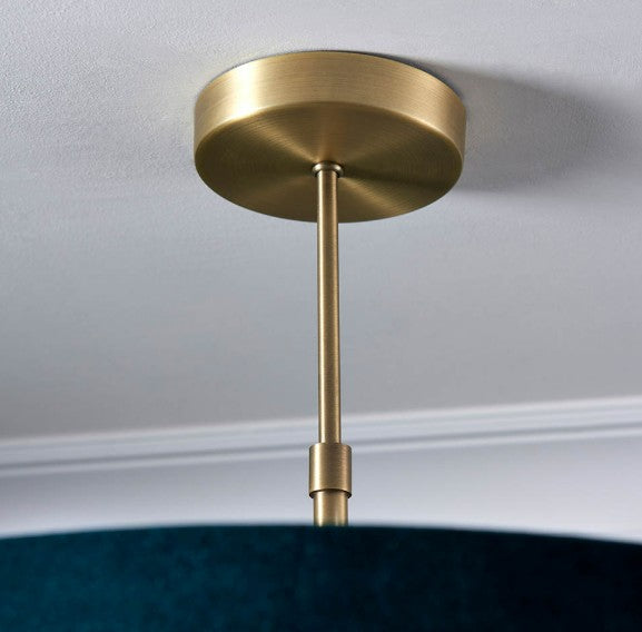 Luxurious, sophisticated ceiling light with understated metalwork in a classic matt antique brass plated finish. Complemented by a rich green velvet shade complete with anti-glare fabric diffuser. Height adjustable via a versatile telescopic central stem.