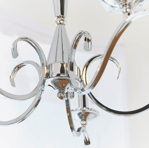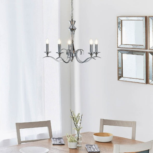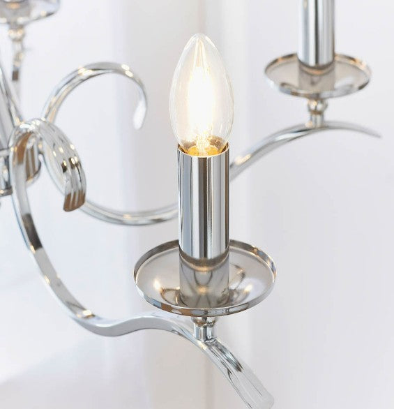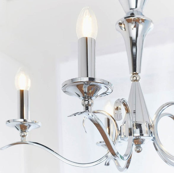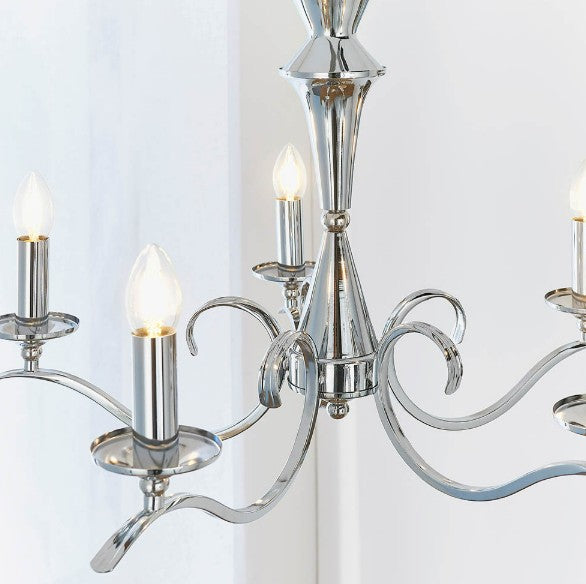 The Kora 5 light chandelier is finished in chrome effect, this fitting has an adjustable drop and can also convert to a flush fitting, is suitable for use with LED lamps and is dimmable. Also available in alternative finish and 8 light version.