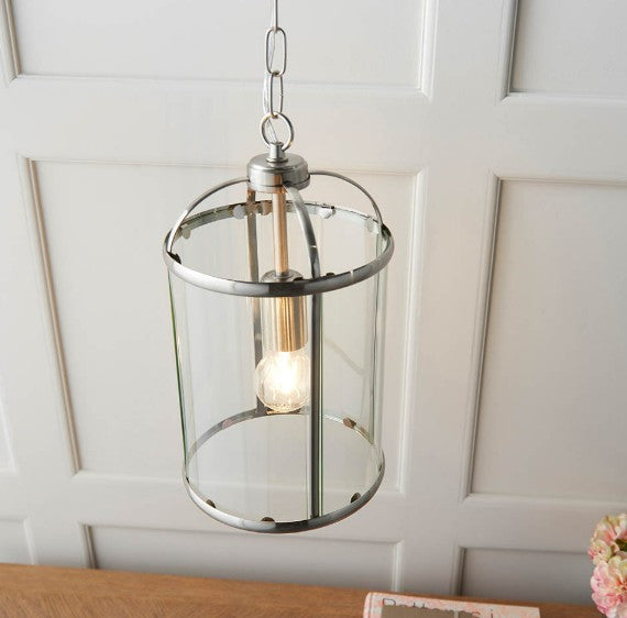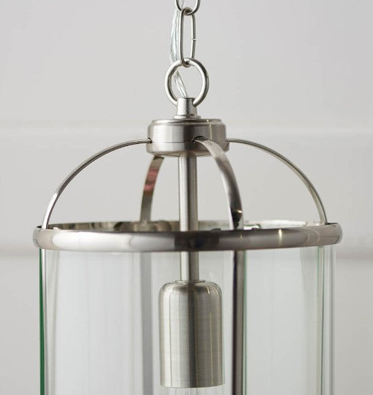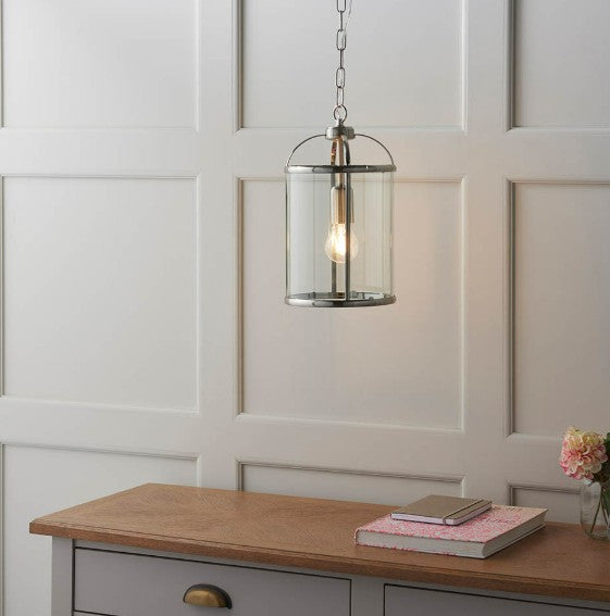 The Lambeth 1 light pendant has an adjustable drop and combines a metal frame work with a satin nickel finish and clear glass panels. Suitable for use with LED lamps and dimmable. Other size and finish options also available