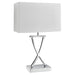 Add this eye-catching Club table lamp to any modern home setting seeking a touch of contemporary style. The quirky x base has a chrome finish and is complete with a white fabric rectangle shade. Place in your living room, dining room or bedroom.