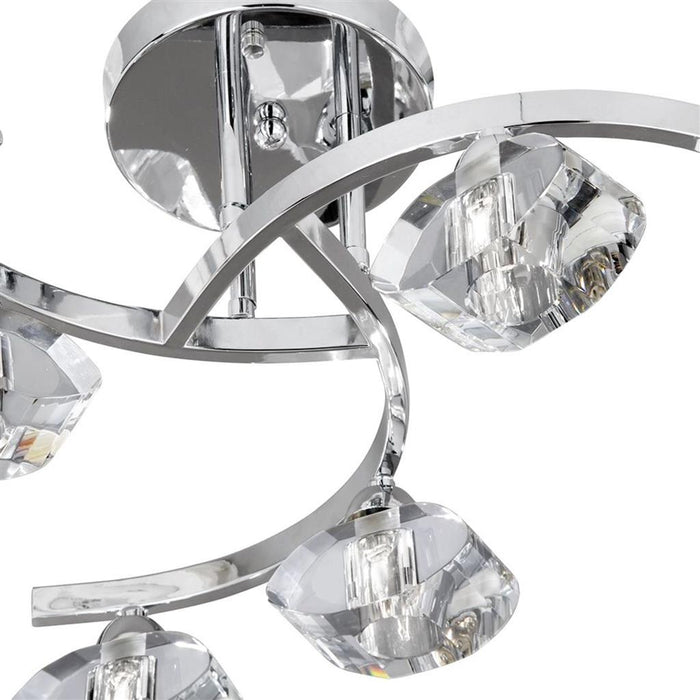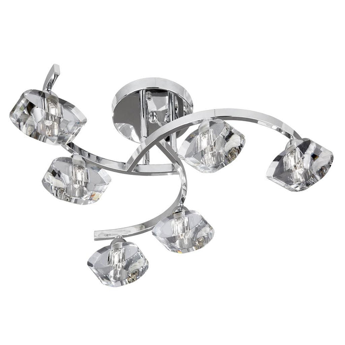 This Sculptured Ice II chrome 6 light curved semi-flush with clear shaped glass is ultra-modern and stylish. The fitting has a circular ceiling plate finished in chrome and three curved arms leading to the stunning six oval glass shades. And it provides a practical source of light for any contemporary bedroom, living room, dining room or kitchen ceiling.