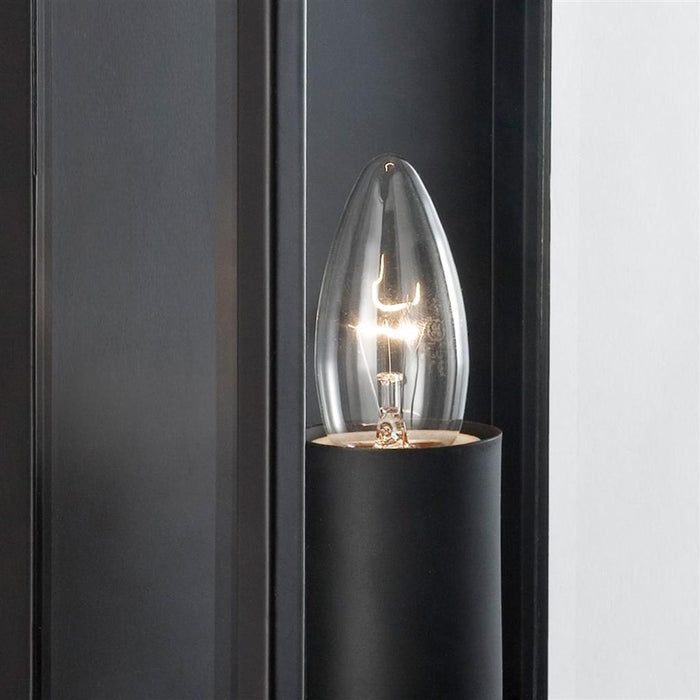 The black metal Box outdoor light features clear Bevelled glass panels around the sides and is lit by an attractive candle style light fitting. It's perfect for lighting your outdoor walls and is IP44 rated and fully splashproof to protect against the elements.
