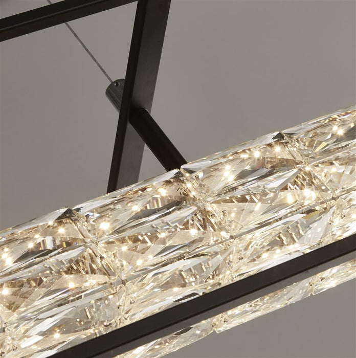 Elevator is a stunning height adjustable pendant light which would add impact to any bedroom, living room or dining room. With a matt black metal rectangular frame with beautiful oblong coffin drop crystals in the centre, this creates a focal feature to any home. LED's use up to 75% less energy and last up to 20 times longer than incandescent bulbs.